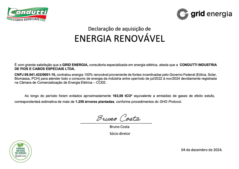 A empresa utiliza energia proveniente do Mercado Livre, priorizando fontes renováveis e contribuindo para a redução das emissões de gases de efeito estufa. Mantemos certificados e comprovações atualizados sobre o consumo de energia limpa.