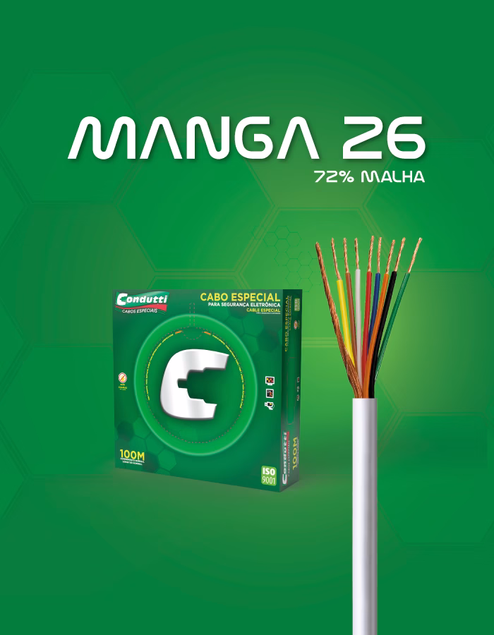 Fabricado com condutores 100% COBRE 26AWG, os cabos de MANGA 26AWG Condutti é aplicado em sistemas de CFTV e Vídeo porteiro em baixas distâncias.